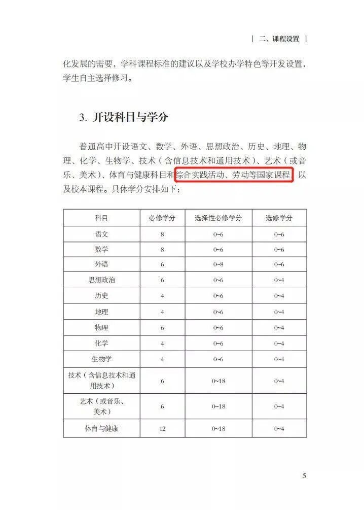 最新方案中,后面的科目设置与学分也有变化,方案要求,普通高中开设语文、数学、外语、思想政治、历史、地理、物理、化学、生物学、技术(含信息技术和通用技术)、艺术(或音乐、美术)、体育与健康科目和综合实践活动等国家课程以及校本课程之外,还应开设劳动课程,劳动共6学分,其中志愿服务2学分,在课外时间进行,三年不少于40小时;其余4学分内容与通用技术的选择性必修内容以及校本课程内容统筹。