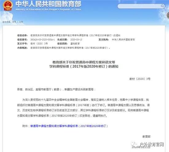 为深入贯彻党的十九届四中全会精神和全国教育大会精神,落实立德树人根本任务,完善中小学课程体系,教育部组织对普通高中课程方案和语文等学科课程标准(2017年版)进行了修订。普通高中课程方案以及思想政治、语文、历史和生物学课程标准修订涉及前言及正文部分,其他学科课程标准修订仅涉及前言部分。