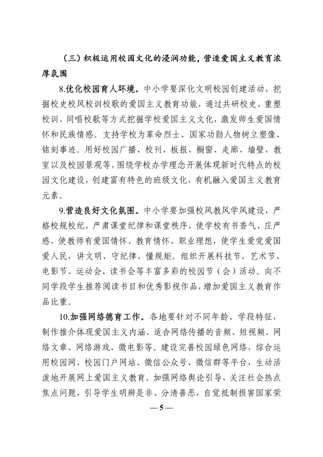 《工作方案》明确了五项重点任务。一是充分发挥课堂教学主渠道作用,推动爱国主义教育进课堂进头脑。要推进思政课改革创新,有机融入爱国主义故事、战“疫”故事、先进典型事迹以及形势与政策要闻等鲜活素材,不断增强思政课的思想性、理论性和亲和力、针对性,挖掘各学科育人资源,统筹地方和校本课程,构建爱国主义教育和知识体系教育相统一的育人机制。二是不断丰富德育活动的形式内容,激发爱国主义真挚情感。要丰富德育活动内涵,组织开展以“我和我的祖国”为主题的爱国主义教育活动,发挥仪式教育作用,注重节庆纪念日教育,发挥团队组织教育功能,激发情感共鸣,强化国家意识和集体观念,增进民族自豪感和文化归属感。三是积极运用校园文化的浸润功能,营造爱国主义教育浓厚氛围。要优化校园育人环境,挖掘校史校风校训校歌的爱国主义教育功能,加强校风教风学风建设,创建富有特色的班级文化,营造良好文化氛围,加强网络德育工作,生动活泼地开展网上爱国主义教育。四是注重发挥实践育人功能,促进中小学生爱国行为养成。要发挥劳动综合育人功能,开齐开足劳动教育必修课,有目的、有计划地组织学生参加日常劳动、生产劳动和服务性劳动,丰富综合实践活动,推动中小学综合实践活动课程常态化实施,打造中小学生社会实践大课堂。五是始终坚持协同共育,形成爱国主义教育良好社会环境。要强化典型引导作用、家校协同作用、部门联动作用,深入挖掘和宣传国家功勋模范人物、先进典型的突出事迹,推动各类先进人物进校园开展思想政治工作,持续开展家庭教育主题宣传活动,搭建社会育人平台,实现爱国主义教育资源的共建共享。