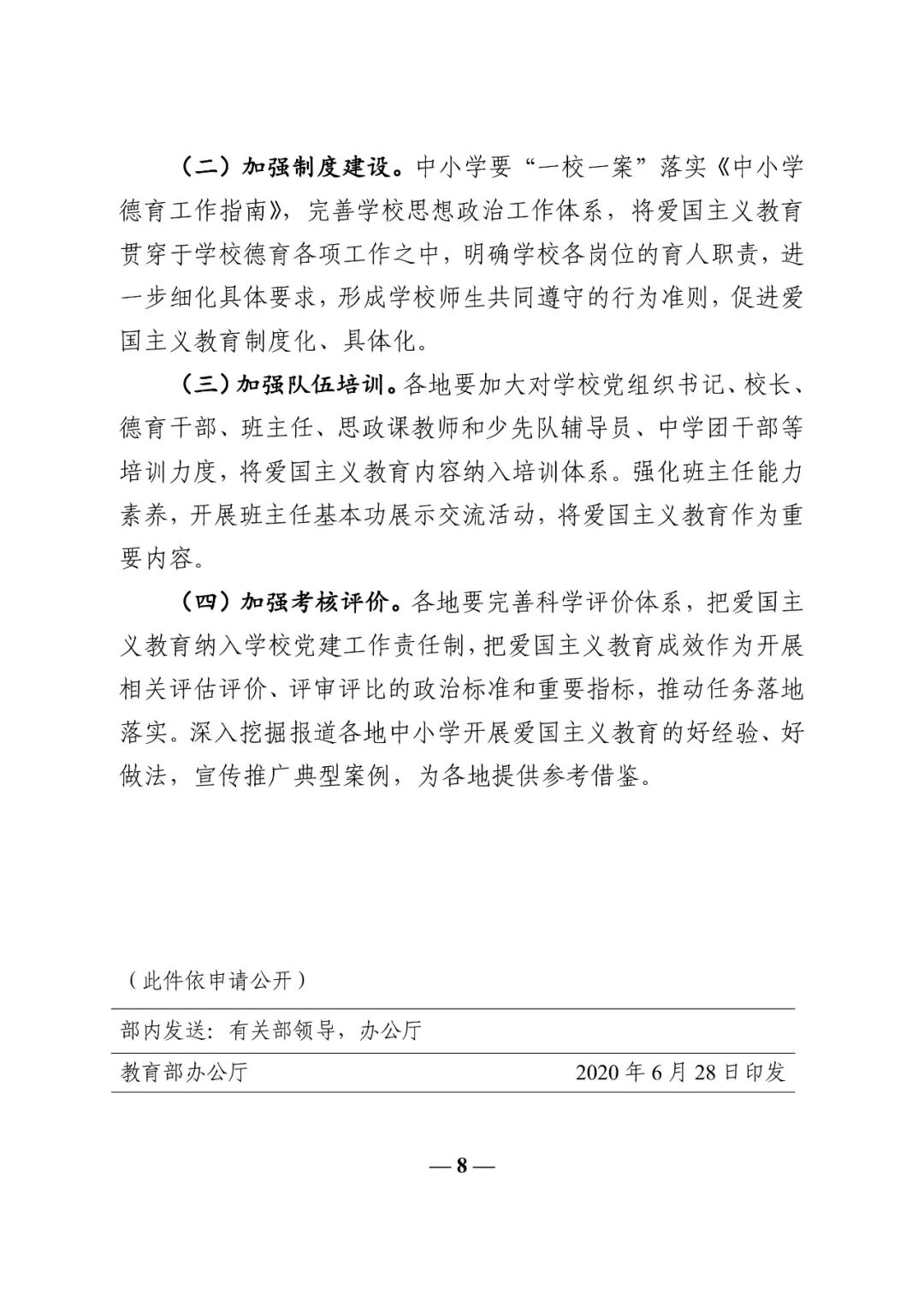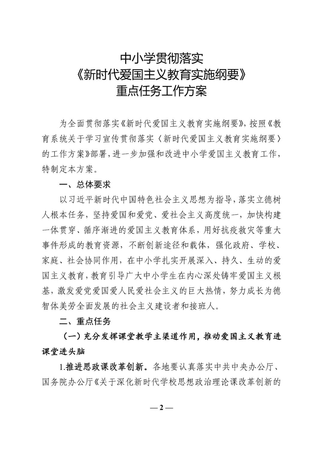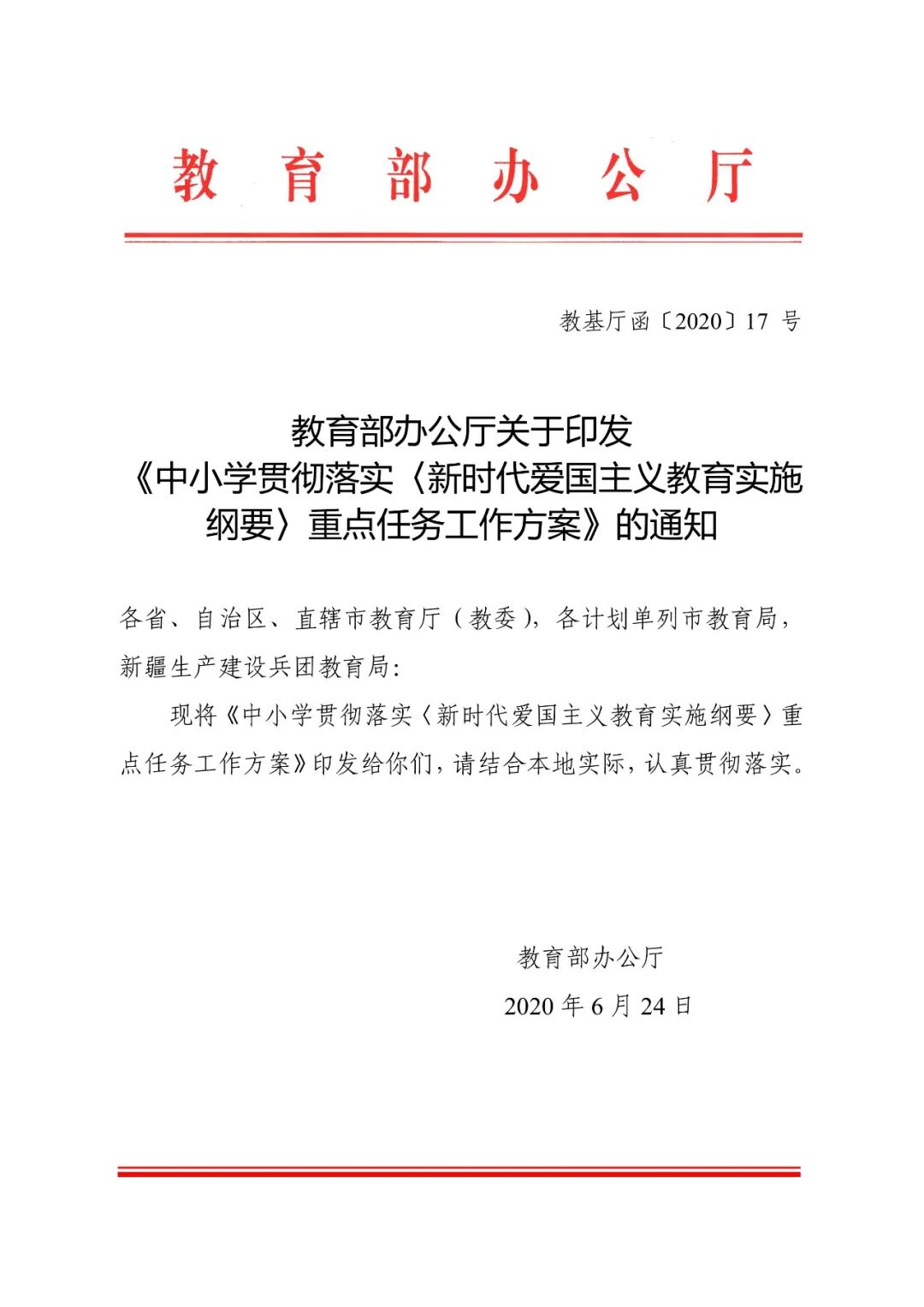 为全面贯彻落实《新时代爱国主义教育实施纲要》,按照《教育系统关于学习宣传贯彻落实〈新时代爱国主义教育实施纲要〉的工作方案》部署,日前,教育部办公厅下发通知,印发《中小学贯彻落实〈新时代爱国主义教育实施纲要〉重点任务工作方案》,(简称《工作方案》)进一步加强和改进中小学爱国主义教育工作。