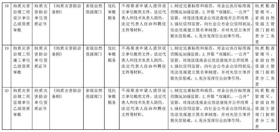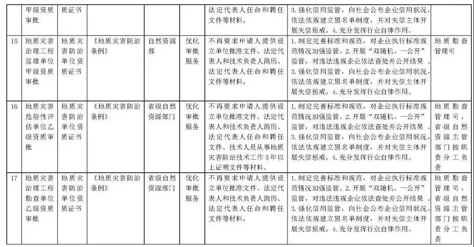 2.对“地质灾害危险性评估单位甲级资质审批”“地质灾害治理工程勘查单位甲级资质审批”“地质灾害治理工程设计单位甲级资质审批”“地质灾害治理工程施工单位甲级资质审批”“地质灾害治理工程监理单位甲级资质审批”“地质灾害危险性评估单位乙级资质审批”“地质灾害治理工程勘查单位乙级资质审批”“地质灾害治理工程设计单位乙级资质审批”“地质灾害治理工程施工单位乙级资质审批”“地质灾害治理工程监理单位乙级资质审批”等10项涉企经营许可事项,精简审批材料,减轻企业负担。(责任单位:地质勘查管理司,省级自然资源主管部门按职责分工负责)