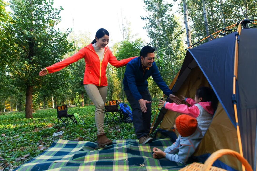 在户外条件下,父母分工支帐篷、料理,带孩子认知自然界的花鸟虫鱼、体验露营、攀登、飞蝇钓等户外生活方式。