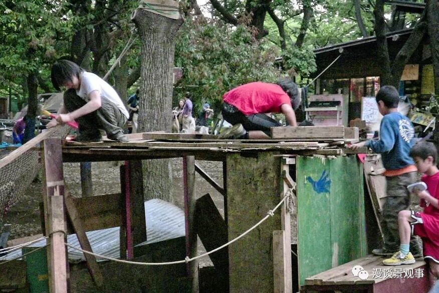 我相信很多父母和我一样,在孩子成长的过程中总是担心他还太小,容易受伤,花了很多时间精力去帮孩子规避我们眼中危险的场景。 不过,加拿大的研究人员在2015年发布的室外冒险游戏与儿童健康报告中指出冒险在儿童发展中是非常必要的。 学习如何承担风险和保护自己是儿童成长过程中的必修课。 行为生物学家阮倪也解释说人类的青少年时期相比其它灵长类是很长的,他们需要利用这段时间通过玩耍的方式去体验迈出舒适区的感觉,明白自己的极限,从而学习和掌握如何安全地去使用自己的身体与周边的世界互动。 冒险是孩子们的天性 (source:https://activeforlife.com/lifeguard-in-risky-play/) 专家们还发现,孩子们在传统游乐场中反而更加无所顾忌,本来是用来保护孩子们的橡胶软垫却给了他们想怎样就怎样也不会受伤的错觉,反而不利于孩子们的成长。 英国和德国已经率先在游戏场所中引入了冒险元素,甚至开始变成了孩子们的谈资。 据统计,欧洲总共已经建造了大约1000个冒险游乐场地了。 01 / 英国北威尔士 The Land 英国的北威尔士有一个另类的游乐场,门口的栅栏上写着“一切皆有可能之地”。 这55平米的草地上有一条孩子们自己摆放的木板路,草地中还有一条小溪穿过,孩子们可以抓着绳子荡过去。 除了狂野的玩乐设施,这里还会允许孩子们使用像锤子和钉子这样“大人们”的工具,去真正地建造而不只是堆一堆乐高积木,甚至还可以在游戏场管理员的督导下玩火。 孩子们在游戏场管理员的督导下观察火焰(source:https://www.npr.org/sections/ed/2015/04/03/395797459/the-value-of-wild-risky-play-fire-mud-hammers-and-nails) 导演艾琳·戴维斯专门为The Land拍摄了一部纪录短片,此片随后被称之为过度保护子女的父母们的恐怖片。 The Land剪影(source:https://sugarspiceandglitter.com/the-land-adventure-playground/) 在访谈中,戴维斯分享了自己的看法:“我觉得现在的孩子们和以前的一样,或者说他们一直是这样的。孩子们会被同样的东西所吸引,他们喜欢爬高,捉迷藏,玩水和玩火。他们会创造并遵循自己创造的等级制度和游戏规则。 简单来说,他们有自己的世界。只不过在现今的社会中,他们并不总是能够表达自己对这些东西的兴趣,也很缺乏接触到这些的机会。我们成年人可能会惊讶于他们在这一片”废墟“之中是如何得以享受的,但是他们超群的想象力能化腐朽为神奇。我们真的应该更加信任我们的孩子们。” 学习使用工具的男孩(source:https://www.positive.news/lifestyle/wellbeing/the-rise-of-risky-adventure-playgrounds/q) 不过也有很多父母惊呼:“这简直就是我们的童年!我们小的时候没有那么多玩具,就是这样什么都玩,不过我记得我们一直都很小心,从没见人受过严重的伤。” “而且我们得承认,孩子们总归会接触到这些所谓的”危险品“的。我不相信有一个孩子没有背着父母偷偷地玩过火。但是至少在这里,有游戏场管理员的督导。我认为没有绝对的安全,一个尽可能安全的环境是没有必要的,我们只需保证必需的安全就可以了。我想这也是危险教育的课堂吧”,戴维斯补充道。 The Land剪影(source:https://www.theatlantic.com/education/archive/2014/03/europes-adventure-playgrounds-look-way-more-fun/284521/) 02 / 美国总督岛 The Yard 像“废旧场”一样的游戏场地并不是英国独有。 纽约港的总督岛也 有一个占地大约4500平米,供6到13岁儿童游玩的另类游乐场。 由play:groundNYC开发的The Yard游乐场(source:http://rootswingsandtravelthings.com/the-yard-on-governors-island-an-adventure-playground-in-new-york-city/) 像攀爬架、滑梯和秋千这种在传统游乐场地中常见的设施在这里一概看不到,取而代之的却是商店里淘汰的假模特、木制海运箱、轮胎、床垫、一架旧钢琴和其他废旧物。 另类攀爬架(source:https://www.nytimes.com/2016/05/29/nyregion/on-governors-island-mountains-of-junk-where-children-find-adventure.html) 在成人看来简直是个废品回收站的地方,在孩子们的眼里却是令人眼前一亮的游乐天堂。 这座游乐场还有一些其他游乐场没有的规矩,例如不允许使用电子设备,不许穿人字拖。 不过最特殊的就是这里不允许家长入内。 游乐场的栅栏门上公然贴着一张手写横幅,上书:没有你的建议孩子们也能行。 栅栏门上的手写横幅(source:https://www.nytimes.com/2019/05/10/well/family/adventure-playgrounds-junk-playgrounds.html) 写着“请勿打扰正在玩耍的孩子们”字样的告示板(source:http://rootswingsandtravelthings.com/the-yard-on-governors-island-an-adventure-playground-in-new-york-city/) 对普通游乐场习以为常的家长们到了这里自然是非常不习惯,纽约游乐场的负责人黎贝卡·福克纳介绍说有些家长对这里感到十分新奇,他们会扒着栅栏门向里面看,像是在观赏动物园的猴子一般。 “我会过去安慰他们,告诉他们孩子们没问题的,你们就坐在这里好好休息吧”,黎贝卡说。 在另类游乐场中玩耍的孩子们(source:https://www.govisland.com/things-to-do/recreation/the-yard) 游乐场中有些是孩子们在生活中见过的物件,有些则是非常陌生的,但是在这里他们可以随意处置这些零件而不必遵守干净整洁或者爱惜爱护这样的规矩。 在床垫上画画?没问题。 把遮阳伞剪个口子?没问题。 可以想象这个地方能够满足多少孩子们的好奇心和探索欲。 爬高上低(source:https://www.positive.news/lifestyle/wellbeing/the-rise-of-risky-adventure-playgrounds/) 因为冒险而信心满满的孩子们(source