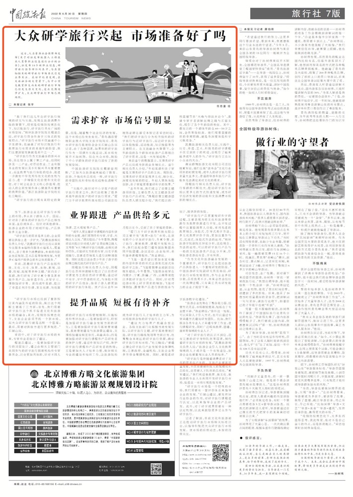记者了解到,目前文化和旅游部正在推动研学旅行市场相关标准出台,以指导和规范大众研学旅行市场发展。该市场的后续动态,中国旅游报将持续关注。