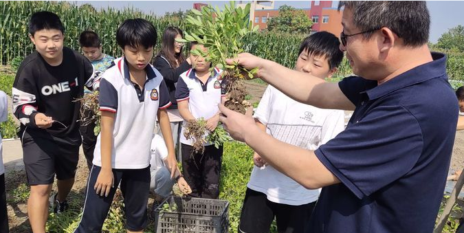 清明前后,种瓜点豆。劳动教育教师带领学生们来到农学院,打脊子、种豆子、浇浇水、施农肥……在劳动中认识单子叶、双子叶的植物种类,习得生物学知识。