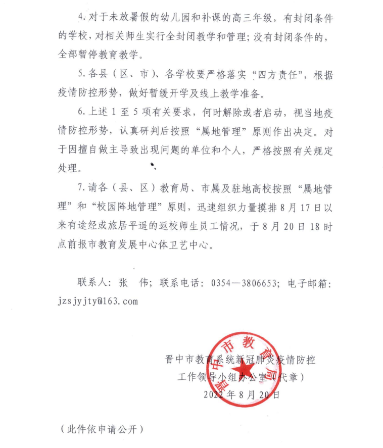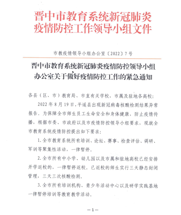 各县(区、市)教育局、市直有关学校,市属及驻地各高校:2022年8月19日,平遥县出现新 冠病毒核酸检测结果异常报告。为保障全市师生员工生命安全和身体健康,防止疫 情传播,根据市委、市政府以及市疫 情防控领导小组要求,现就全 市教育系统疫 情防控提出如下要求:1 .全市教育系统所有培训、论坛、赛事、检查评估、调研、 军训等聚集性活动,一律暂停。2 .全市所有中小学、幼儿园以及市属和驻地高校已经安排开学返校的,一律暂停返校。已返校的师生实行三天静态封闭管理,三天三次核酸检测。3 .全市所有培训机构、青少年活动中心以及研学实践基地一律暂停培训等教育教学活动。4 .对于未放暑假的幼儿园和补课的高三年级,有封闭条件的学校,对相关师生实行全封闭教学和管理;没有封闭条件的,全部暂停教育教学。5 .各县(区、市)、各学校要严格落实“四方责任”,根据 疫 情防控形势,做好暂缓开学及线上教学准备。6 .上述1至5项有关要求,何时解除或者启动,视当地疫 情防控形势,认真研判后按照“属地管理”原则作出决定。对于因擅自做主导致出现问题的单位和个人,严格按照有关规定处理。 7 .请各(县、区)教育局、市属及驻地高校按照“属地管 理”和“校园阵地管理”原则,迅速组织力量摸排8月17日以 来有途经或旅居平遥的返校师生员工情况,于8月20日18时点前报市教育发展中心体卫艺中心。