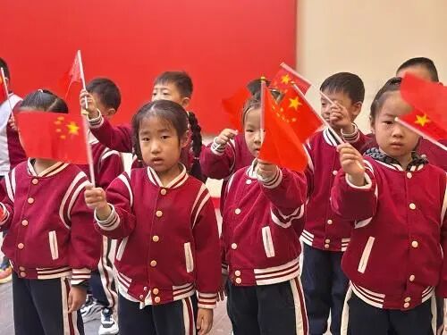 最后,孩子们在基地大厅的党旗前整齐列队,齐声唱响《国旗国旗红红的哩》。稚嫩的歌声清脆响亮,伴随着小手轻轻挥动,眼中满是对国旗的好奇与崇敬。随后,大家又共同表演手势舞《国家》,“一玉口中国,一瓦顶成家”的旋律响起,孩子们认真比划着每一个动作,在肢体与旋律的互动中,悄悄理解“家”与“国”的紧密联系。