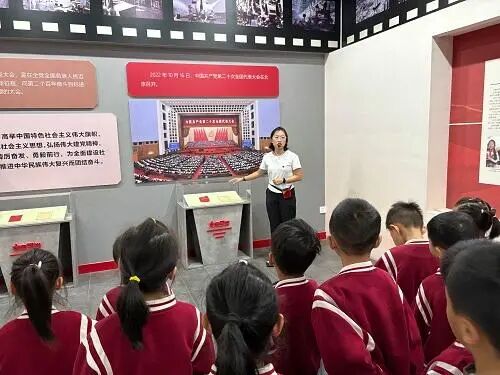 活动中,基地讲解员用生动易懂的语言,结合实物展品与历史图片,向孩子们讲述党的发展历程:从党章的演变故事,到革命先辈为理想奋斗的事迹,原本抽象的历史变得鲜活可感。孩子们睁大眼睛认真倾听,时不时举手提问“他们不怕困难吗”,在互动中悄悄种下红色记忆的种子。