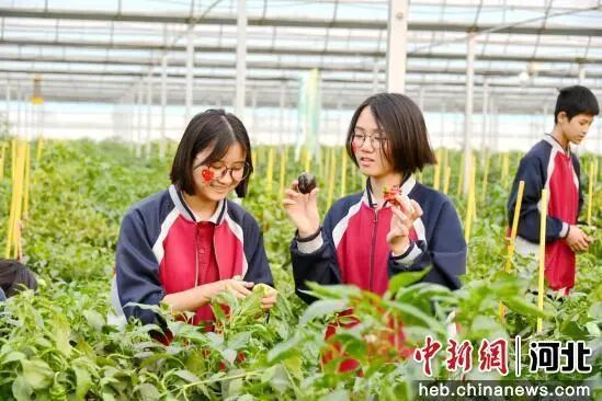 图为河北鸡泽县组织开展“庆丰收、颂祖国”主题研学活动,学生在位于该县的河北省辣椒产业技术研究院辣椒种植温室内参观并参与辣椒采摘实践。 张信波 摄