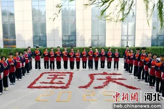 图为河北鸡泽县组织开展“庆丰收、颂祖国”主题研学活动,学生们用辣椒拼出国庆祝福图案。 张信波 摄